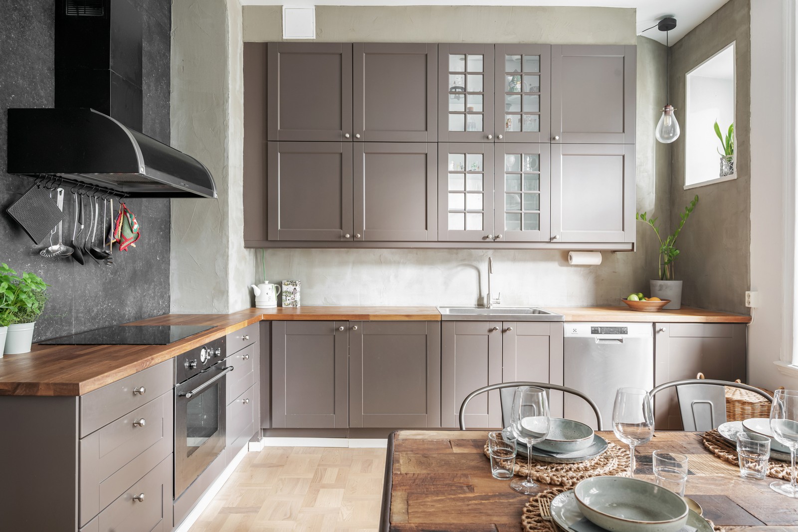 Ett elegant och stilfullt kök med gråa skåpluckor i klassisk design som skapar en tidlös atmosfär. Bänkskivor i trä adderar både värme och en naturlig känsla till rummet, medan den svarta stänkskyddsväggen ger en modern kontrast. Köket som renoverades 2020 är utrustat med en svart fläkt och vitvaror som bland annat tvättmaskin & diskmaskin som smälter in harmoniskt i helheten. Det generösa arbetsytorna och väl genomtänkta förvaringslösningar gör köket både praktiskt och estetiskt tilltalande. Fönstret släpper in rikligt med dagsljus och skapar en ljus och inbjudande miljö. Matplatsen, med sitt rustika träbord, ger rummet en personlig touch och är perfekt för sociala middagar eller avkopplande stunder. Ett kök som förenar funktionalitet med stil och som blir en naturlig samlingspunkt i hemmet.