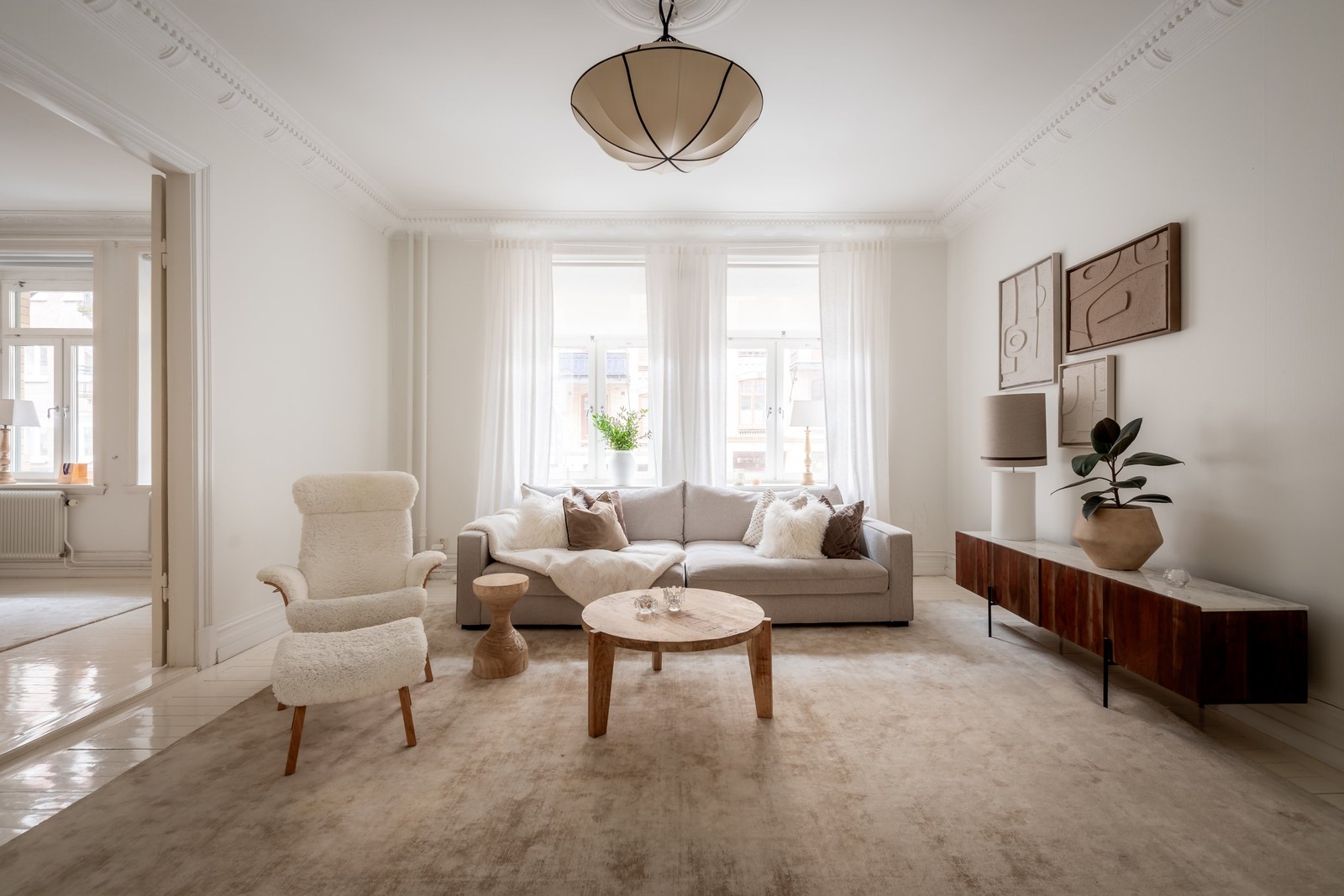 Välkommen till en stor och ståtlig trea på synnerligen attraktiv adress – en bostad där tidstypisk charm möter ljus, rymd och elegans. Här erbjuds generös takhöjd, vackra stuckaturer, vitmålat brädgolv och bevarade originaldetaljer som tillsammans skapar en varm och inbjudande atmosfär. Den pampiga kakelugnen blir ett naturligt blickfång och förstärker känslan av klassiskt sekelskifte. De stora fönstren med djupa nischer släpper in rikligt med ljus och ger bostaden ett lugnt och harmoniskt uttryck. Planlösningen är både funktionell och social med väl tilltagna rum som bjuder in till såväl vardagsliv som umgänge. En mycket tilltalande bostad för dig som söker något utöver det vanliga.
