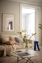 Vidare genom pardörrarna tar man klivet in i det generösa vardagsrummet. Även detta rum med härlig rymd, stora fönster med djup fönsternisch ger södersolens strålar möjlighet att lysa in. Vardagsrummet rymmer med enkelhet såväl soffa som soffbord och matsalsbord för dig som så önskar. Väggarna är målade i samma sobra ton som övriga rum och på golvet är det fina originalgolvet bevarat. Via stora pardörrar i glas nås balkongen som under årets varmare månader blir en förlängning av rummet.