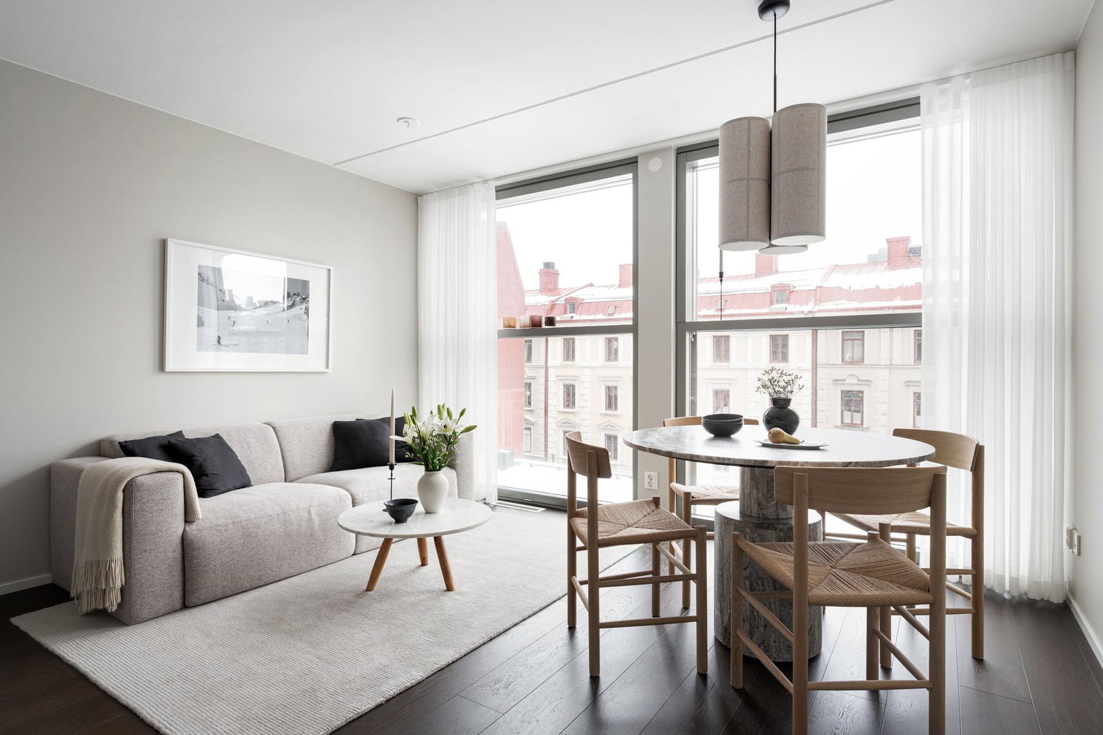 Längre in i bostaden öppnar kök och vardagsrum upp sig i en social och öppen planlösning. Det platsbyggda, takhöga köket från Taras Hallgren & Son förenar stilren estetik med hög funktionalitet. Köksinredningen i massiv ek samspelar med en ljus bänkskiva i granit, medan fullt integrerade vitvaror från Siemens och infällda spotlights i borstat stål under överskåpen bidrar till både komfort och helhetskänsla. Vardagsrummet karaktäriseras av ett generöst ljusflöde tack vare stora panoramafönster som löper från golv till tak och sträcker sig längs hela väggen. Med sänkbara fönsteröverdelar kan bostaden enkelt öppnas upp för ett generöst ljusinsläpp under sommaren.