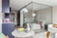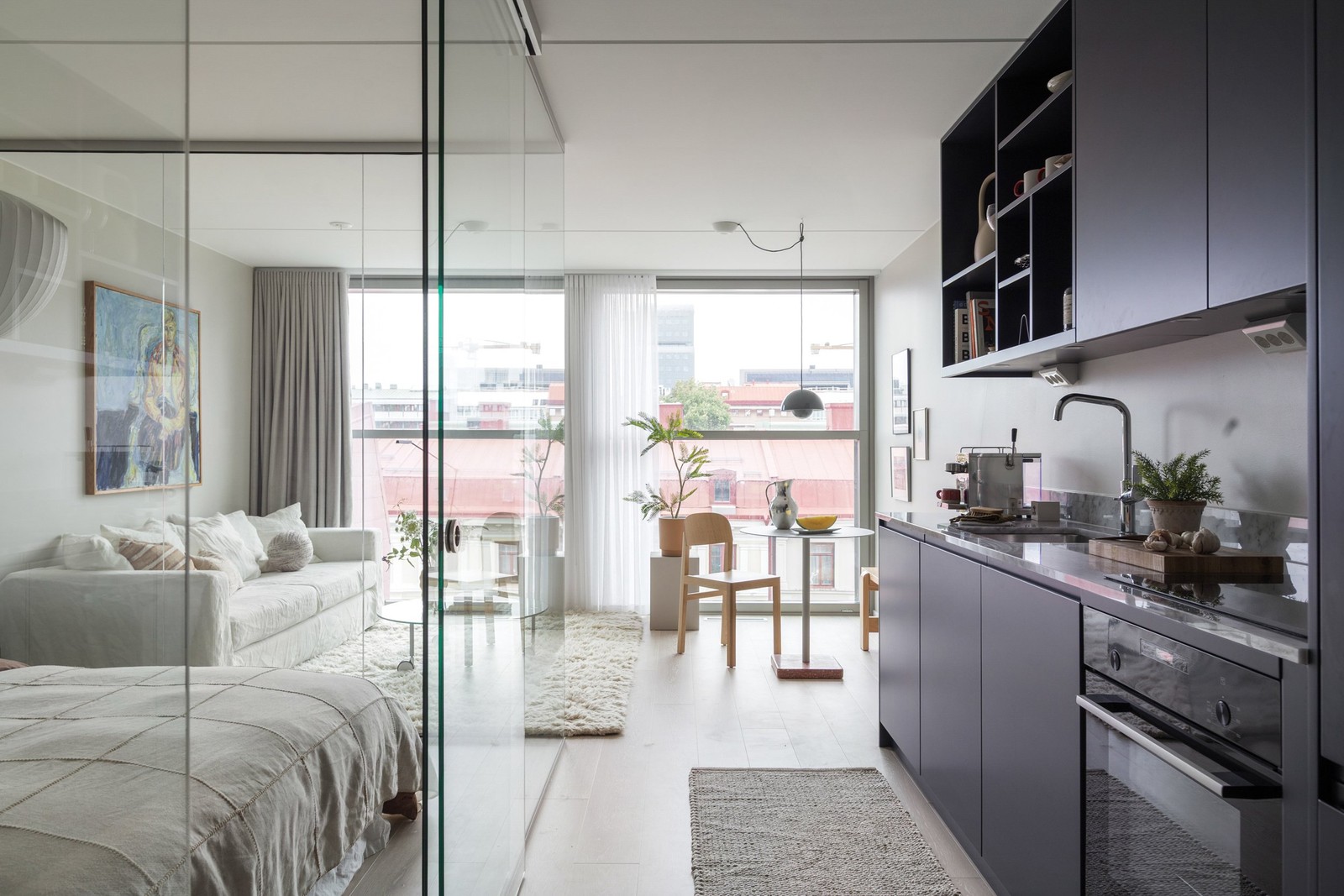 Lägenhetens planlösning är öppen och luftig med innerväggar i glas vilket skapar en genomgående rymlig atmosfär och ett ljusinsläpp utöver det vanliga.