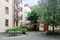 Gemensam innergård som om sommaren möbleras med utemöbler.