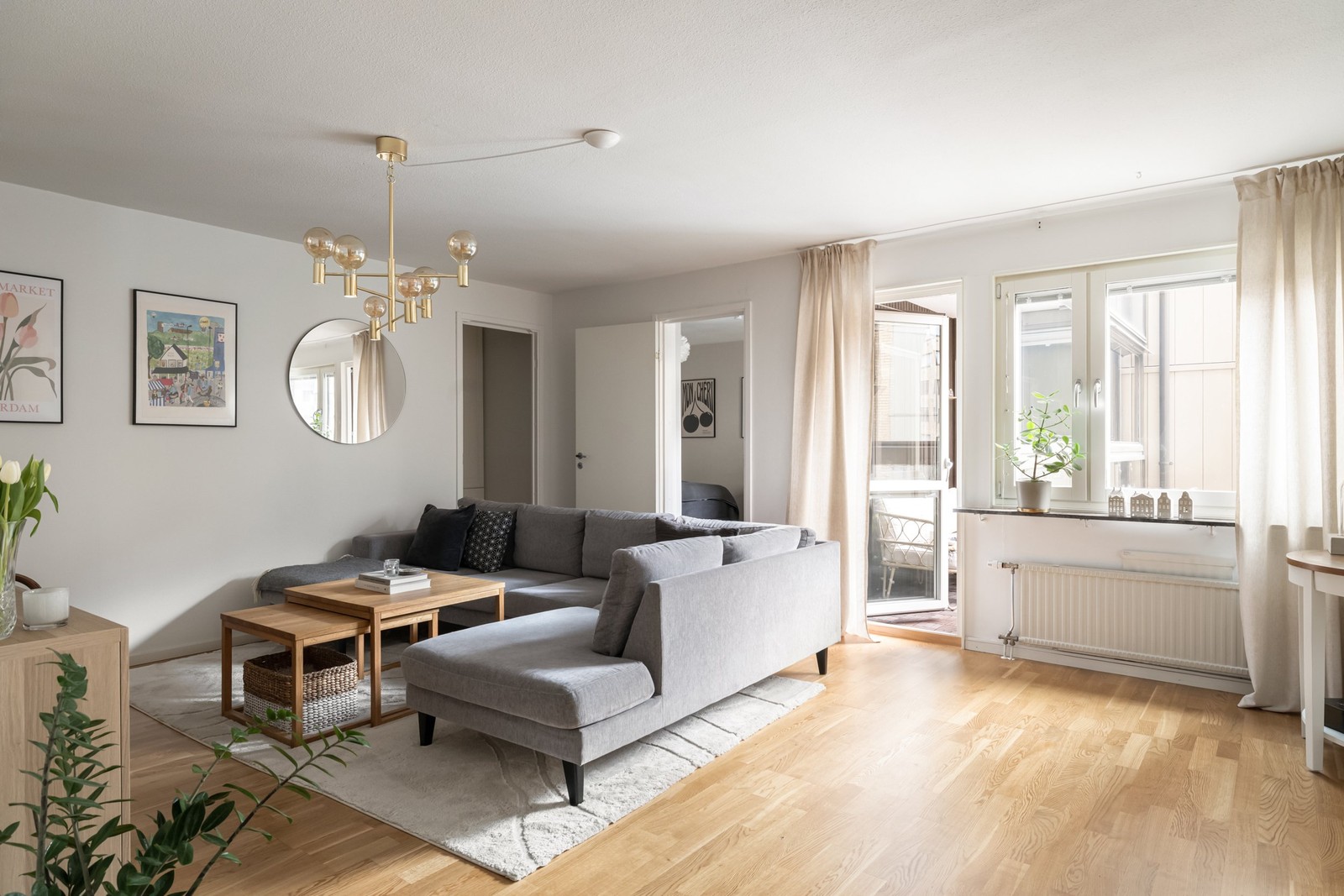 Vardagsrummet utgör bostadens naturliga mittpunkt, varifrån samtliga rum nås. Den vackra parketten samspelar fint med de ljusa väggarna och skapar en trivsam helhet. De generösa ytorna ger plats för en större soffgrupp med tillhörande möblemang. Fönster och balkongdörr vetter mot den lugna innergården och bidrar till ett härligt ljusinsläpp.
