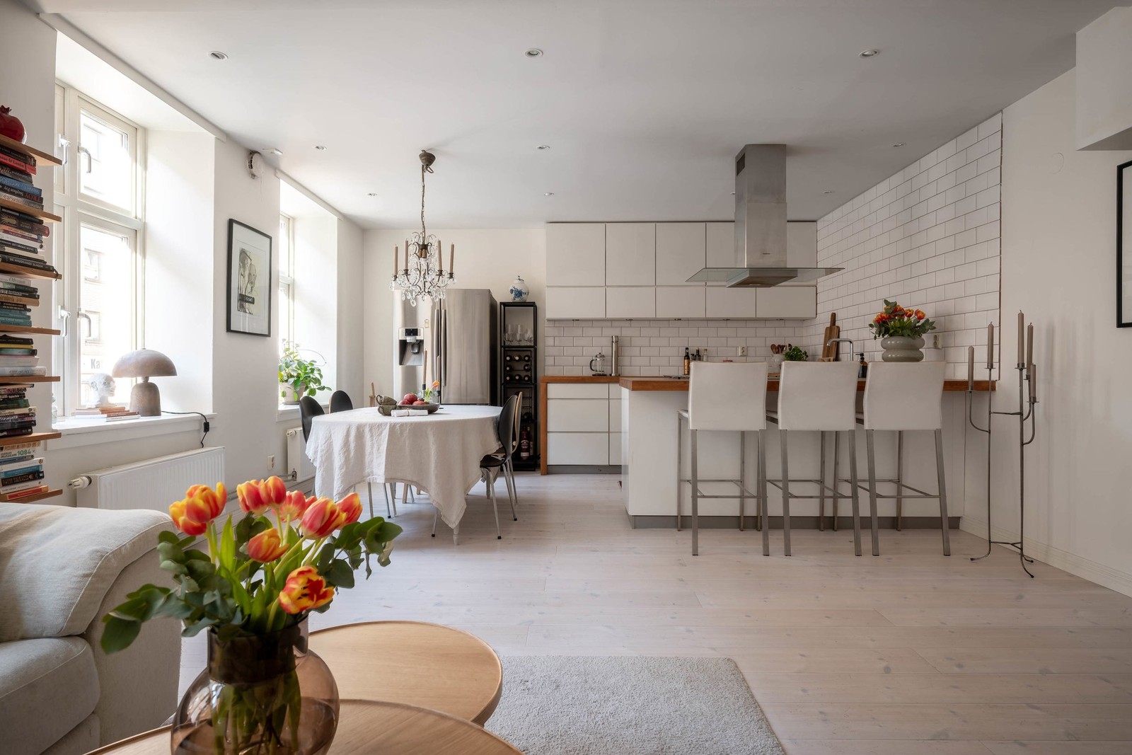 Vardagsrum och kök i öppen och social planlösning. Här finns plats för stort matbord, soffgrupp och tillhörande möblemang. Tre stora fönster bjuder in rikligt med dagsljus och skapar en ljus och trivsam atmosfär. Genomgående i bostaden ligger ett vackert brädgolv i furu tillsammans med ljust målade väggar.