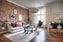 Till höger når du det generösa vardagsrummet. Här är charmen påtaglig. Tegelväggen är framtagen, takhöjden är ansenlig och det stora och djupa fönstret är på plats. För att inte nämna de fina listverken. Här befinner du dig högt över gatan. Rummet har plats för både soff- och matgrupp samt ytterligare möblemang efter önskemål. På golvet ligger en fin ekparkett och väggarna är ljusa.