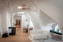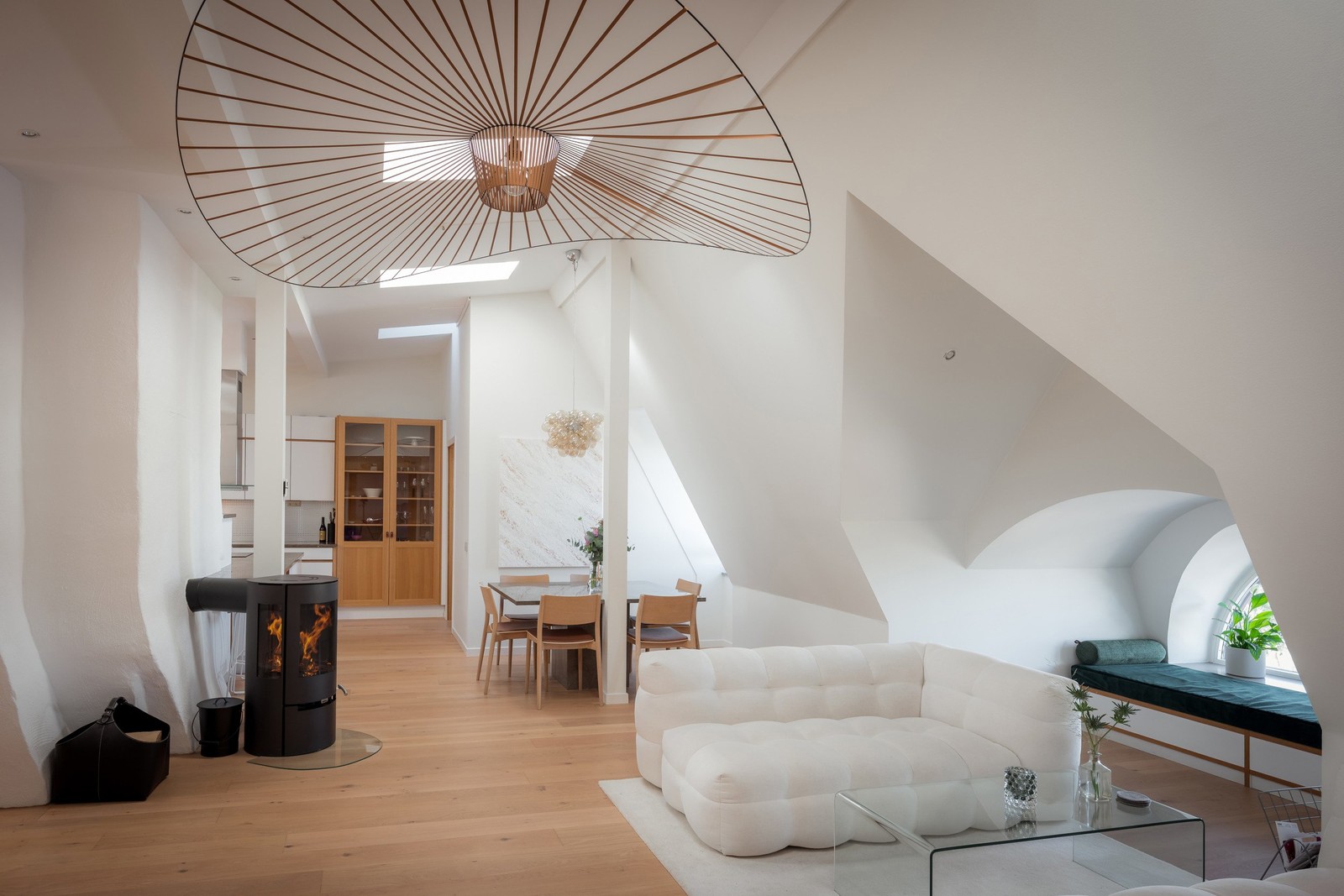 Bakom just halvmånefönstret sveper den spektakulära vindsvåningens ljusa sällskapsytor ut under det höga taket. Från den platsbyggda bänken intill den vackra takkupan är utsikten milsvid över grönskan och innerstadens takåsar. Atmosfären häruppe är extra speciell när solen går ner vid horisonten. Bostaden präglas av öppen planlösning och fascinerande arkitekturlinjer som stiger upp till den höga nocken. Känslan av rymd, ljus och fria ytor är påtaglig. Ut mot Heden och utsikten vetter tre av de fyra rummens takkupor. Förklaringen till den ljusa interiören – utöver de vita väggarna och den genomgående ljusa ekparketten – är takets sju takfönster med djupa slussar. Kvällstid syns stjärnhimlen och våningens downlights understryker de dramatiska taklinjerna. De rymliga sällskapsytorna med eldningsbar braskamin ligger i öppen planlösning med matsalsdelen och det stilrena köket. Köket kommer från Kvänum och har slätvita fronter, dolda beslag och inslag av ek. Köksön och arbetsytorna har skivor i kalkstenstypen Azul Valverde.