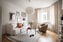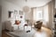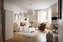 Vidare in i vardagsrummet med plats för både soffa, tv-möbel och skrivbord. På golvet ligger ekparkett och väggarna är vita. Rymlig sovalkov med plats för stor dubbelsäng.