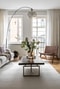 Vardagsrummet ligger mot Lorensbergsgatan och rymmer såväl soffgrupp som matgrupp för den som önskar. Stora fönsterpartier samt en fransk balkong.