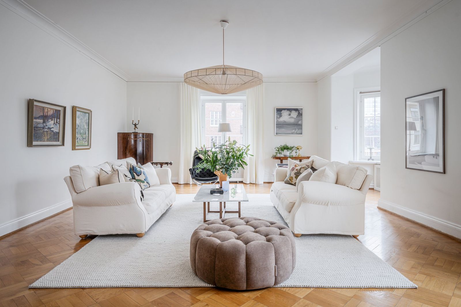 Med utsikt över Korsvägen sveper paradvåningens ekparketter ut längs 20-talets tidlösa detaljer