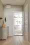 Välkomna in i en generös hall med gott om plats för avhängning och förvaring. Till höger, bakom en vit funkisdörr är bostadens tvättstation beläget med tvättmaskin och överskåp. I hallen är väggarna är klädda i en fantastiskt ljust mintgrön tapet som fint smälter samman med lägenhetens 40-tals charm. På golvet ligger ett vackert framtaget och slipat brädgolv som harmoniskt löper vidare genom hela bostaden.