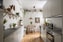 Till vänster om hallen nås det fina köket beläget i härligt läge med utsikt över föreningens magiska innegård. Med genomtänkta detaljer med rena linjer, balanserade proportioner och ljusets spel på släta ytor finner man både de moderna som möter 40-talsstilen, här har inget lämnats åt slumpen. Köket och väggarna är målat i en beige ton som fint smälter samman. Längre in finns en platsbyggd träsoffa med sittbänk omger ett mindre matbord. Arbetsbänken i gråbeige färg kompletteras av vitt kakel i rak sättning. Den maskinella utrustningen inkluderar kyl/frys, diskmaskin, ugn med häll samt fläkt och mikro.