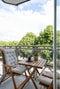 Balkongen erbjuder en rofylld utsikt mot träden. Utrymme ges för både bord och stolar.