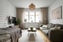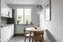 In till höger når man bostadens kök. Här möts du av stilrent vita skåpsluckor och en grå bänkskiva som fint smälter samman med det svarta kaklet bakom. Här finns plats för ett matbord om 4–6 personer, perfekt för att kunna umgås medan maten tillagas. Vitvarorna består av mikro, kyl/frys, ugn, spis och diskmaskin, samt en elegant integrerad vinkyl som lyfter helhetskänslan. På golvet vilar en stilren plastmatta i en grå ton som skapar ett sobert helhetsintryck.