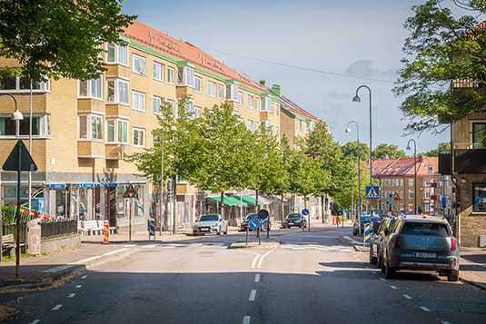 Genom stadsdelen ringlar sig Danska vägen, från Redbergsplatsen hela vägen ner till Örgryte. Längs det här huvudstråket ligger många välbesökta affärer, caféer och restauranger för alla smaker.