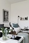 Vardagsrummet är generöst tilltaget och erbjuder en härlig känsla av rymd tack vare det rikliga ljusinsläppet från de stora fönstren. De vitmålade väggarna samspelar fint med den stilfulla ekparketten och skapar en harmonisk, luftig atmosfär. Rummet är lättmöblerat och ger gott om utrymme för en större soffgrupp samt tillhörande möblemang.