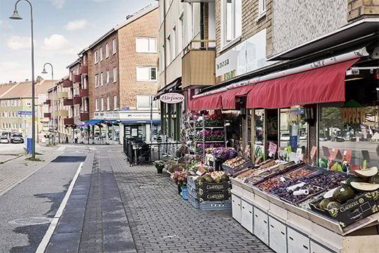 Genom stadsdelen ringlar sig Danska vägen, från Redbergsplatsen hela vägen ner till Örgryte. Längs det här huvudstråket ligger många välbesökta affärer, caféer och restauranger för alla smaker.