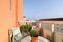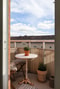 Balkong med plats för caféset där du kan njuta av en fin utsikt bort mot Karlatornet, en perfekt plats för morgonkaffet eller en stunds avkoppling.