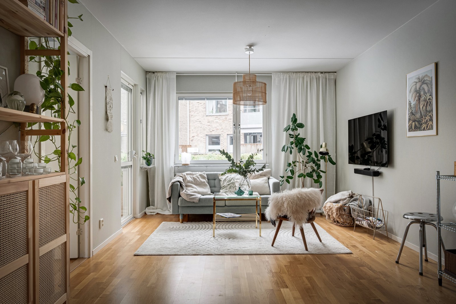 Från den grönskande entrén kommer ni in i den möblerbara hallen som praktiskt knyter samma bostaden. Möjlighet att hänga av sig ytterkläder finns direkt till höger och två garderober finns för ytterligare förvaring. Väggarna är ljusa och på golvet ligger en ekparkett som återfinns i bostadens samtliga rum.