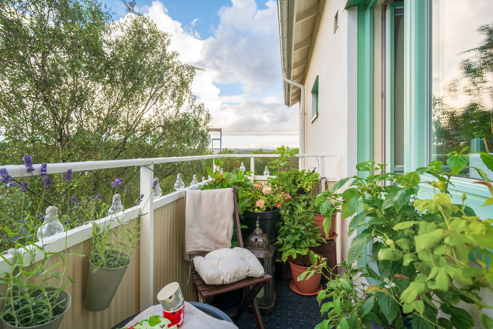 Bostadens balkong ligger i ett högt och fritt läge, helt insynsskyddat. Solens strålar når er från tidig eftermiddag till solnedgång. Balkongen inrymmer plats för bord, stolar och odlingar.