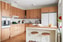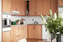 Rymligt kök med en social planlösning tillsammans med det väl tilltagna vardagsrummet. I köket finns spishäll, fläkt, inbyggnadsugn, mikro, diskmaskin, fullstor kyl och frys. Det är väl tilltaget med skåpsluckor i varm ek-kulör samt en bänkskiva i laminat. Ovanför arbetsytan sitter vitt kakel. I köket finns en naturlig plats för ett matbord för fyra eller en köksö som enkelt kan installeras.