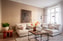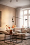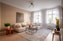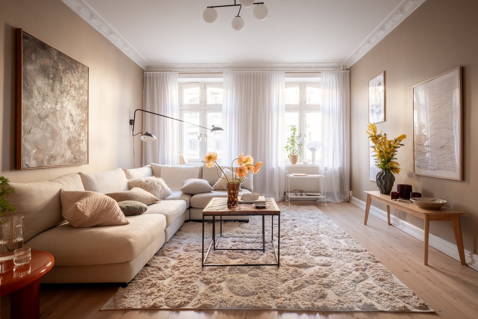 Från hallen nås det generösa vardagsrummet som utgör bostadens naturliga samlingspunkt. Rummets rymd förstärks av den generösa takhöjden och två stora fönster som släpper in rikligt med dagsljus. Vackra originaldetaljer såsom stuckaturer och takrosett ger rummet klassisk landshövdingecharm. Det vitlaserade brädgolvet bidrar till en ljus och varm känsla och här finns gott om plats för både soffgrupp och matsalsmöbel.