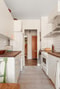 Till vänster finner ni bostadens charmiga kök med ljusa väggar och framtaget plankgolv. Köksinredningen är vit med bänkskiva i mörkt betsat trä. Köksinredningen består av spis med ugn, fläkt, kombinerad kyl/frys samt diskmaskin. Här finns plats för matbord invid fönstret med plats för 4 personer.