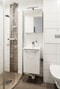 Badrummet nås från hallen och är stambytt samt renoverat i föreningens regi. Det är helkaklat i stilrena färger. Här finns dusch, toalett, handfat med kommod, spegelskåp med belysning samt eluppvärmd handdukstork.