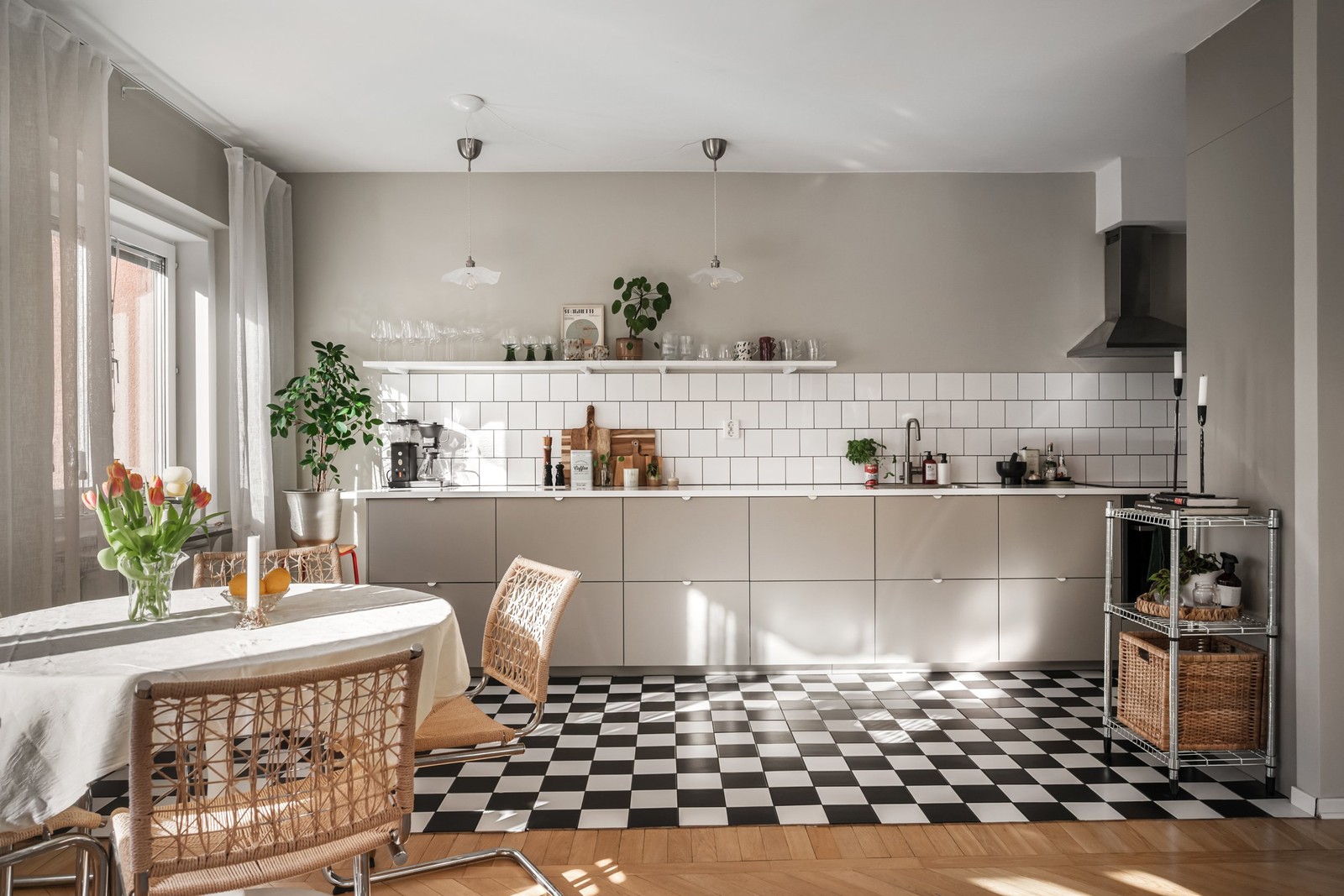Vidare möts ni av ett smakfullt renoverat kök där de varmgrå/beiga köksluckorna går ton i ton mot väggfärgen, vilket smakfullt bryts av med en vit bänkskiva och vitt kakel. Detta är ett kök som bjuder in till matlagning och socialt umgänge i och med den öppna planlösningen mot vardagsrummet. Gott om arbetsyta samt förvaring. Det chackrutiga klinkergolvet tillför till kökets bistrokänsla, vilket rimmar väl med bostadens funkiskaraktär. Den maskinella utrustningen består av spishäll, ugn, fläkt, diskmaskin och kombinerad kyl/frys.
