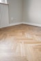 Ljust och inbjudande vardagsrum där den nyslipade fiskbensparketten i original sätter tonen och ger rummet vacker karaktär tillsammans med väggar målade i en varm beige ton. Det finns gott om plats för både soffgrupp och matplats för den som önskar. Från vardagsrummet nås bostadens balkong i soligt västerläge där ni kan njuta av eftermiddags- och kvällssol ända fram till solnedgång. Här ligger en trätrall.