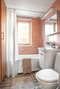 Badrummet är helkaklat med klinkers på golvet. Utrustningen består av dusch, handfat med kommod och wc.