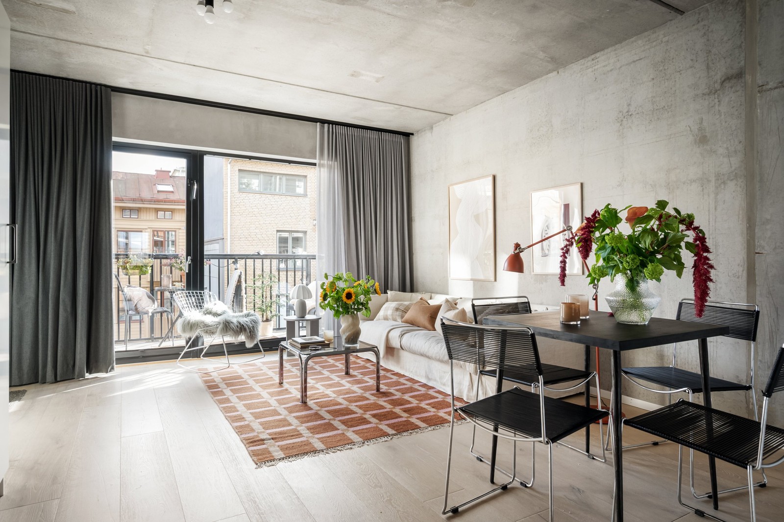 Välkommen in i detta magiska hem! Via föreningens mysiga innergård tar du hissen hela vägen upp till våning tre och kliver in. Redan i hallen slås ni av det underbara ljusinsläpp som präglar bostaden tack vara de öppna ytorna och genomgångsläget med stora fönsterpartier i båda väderstreck. Avhängning finns direkt till höger på såväl hatthylla som i en inbyggd garderob. Intill finns dessutom ett praktiskt städskåp. Varma ekgolv (Pergo Grey Vintage Oak) i kombination med väggarnas och takets råa betong skapar en väldigt speciell och exklusiv känsla. Hemmet värms upp via vattenburen golvvärme som är ansluten till Fjärrvärmesystemet.