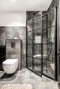 Badrummet följer givetvis samma genomtänkta stil där betongklinker på golvet möter industrikakel på väggarna som ger ett rufft och samtidigt stiligt intryck. Bakom en industriell glasvägg finns duschen och här finns också vägghängd wc, handfat, badrumsskåp och en kombinerad tvättmaskin/torktumlare. Blandare och dusch i matt svart, signerad Grohe. Golvvärme (via el) skänker extra komfort.