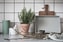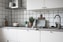 Till höger finns det charmiga köket i ljusa nyanser med gott om förvaringsutrymme. Ovan bänkskivan i grått sitter ett vitt kakel med svarta fogar som skapar en bistrokänsla. Köket är fullt utrustat med spishäll, ugn, fläkt, kyl/frys och diskmaskin. Tapetserade väggar i ljusgrått och på golvet ligger ett framtaget och slipat brädgolv. Den öppna planlösningen mot vardagsrummet gör att en matplats för 6-8 personer enkelt ryms.