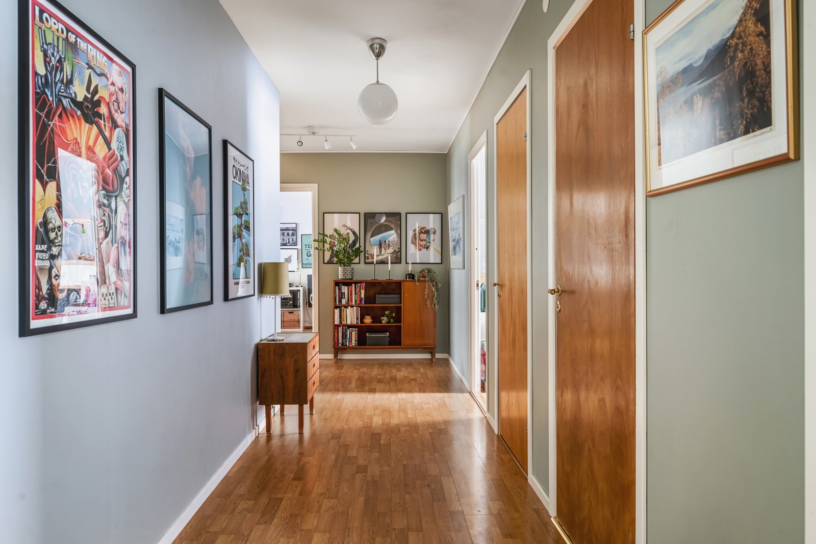 Välkomnande hall med väldigt bra förvaringsmöjligheter. Målade väggar i blå/grön nyans och på golvet ligger ett ljust klickgolv. Hallens ytskikt är nymålade, nya dörrfoder samt ny dörrsockel har installerats.