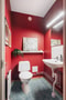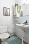 Mellan sovrummen finner ni bostadens två badrum, varav en gästtoalett med kakel bakom handfatet och klinkers på golvet. Det stora badrummet, alldeles intill bjuder på grått klinkergolv och vita kaklade väggar med blågröna accenter. Utrustningen består av handfat med kommod, badrumsskåp med belysning och spegel, stående badrumsskåp, dusch med glasväggar samt handdukstork.