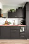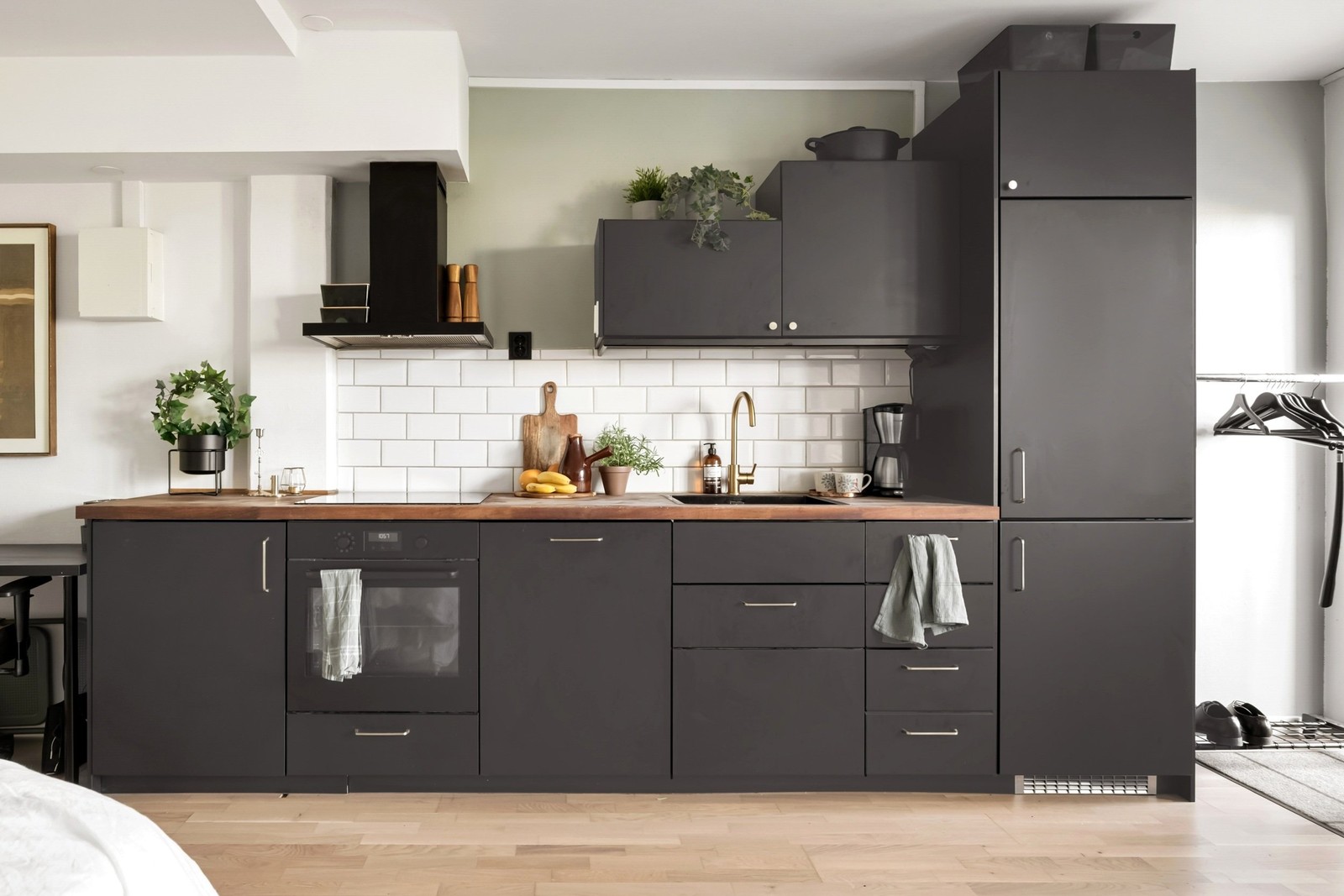 Vidare finner du sällskapsrummet, fördelat på kök, vardagsrum och sovdel. Köket är praktiskt och modernt renoverat. Köksinredningen är svart och ovan bänkskivan i ek sitter ett vitt kaklat stänkskydd i halvförband. Den maskinella utrustningen består av häll, ugn, fläkt, , diskmaskin, mikrovågsugn samt kyl/frys.