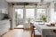 Köket är ombonat och trivsamt med grå snickarinredning som harmonierar fint med bänkskiva och stänkskydd i marmor. Här erbjuds generösa förvaringsmöjligheter i både bänk- och överskåp samt ett praktiskt skafferi. Den maskinella utrustningen består av spishäll, ugn, fläkt, diskmaskin samt kyl och frys. Intill fönstret finns plats för ett matbord för cirka sex personer, med utsikt över uteplatsen och dess lugna, grönskande omgivning.