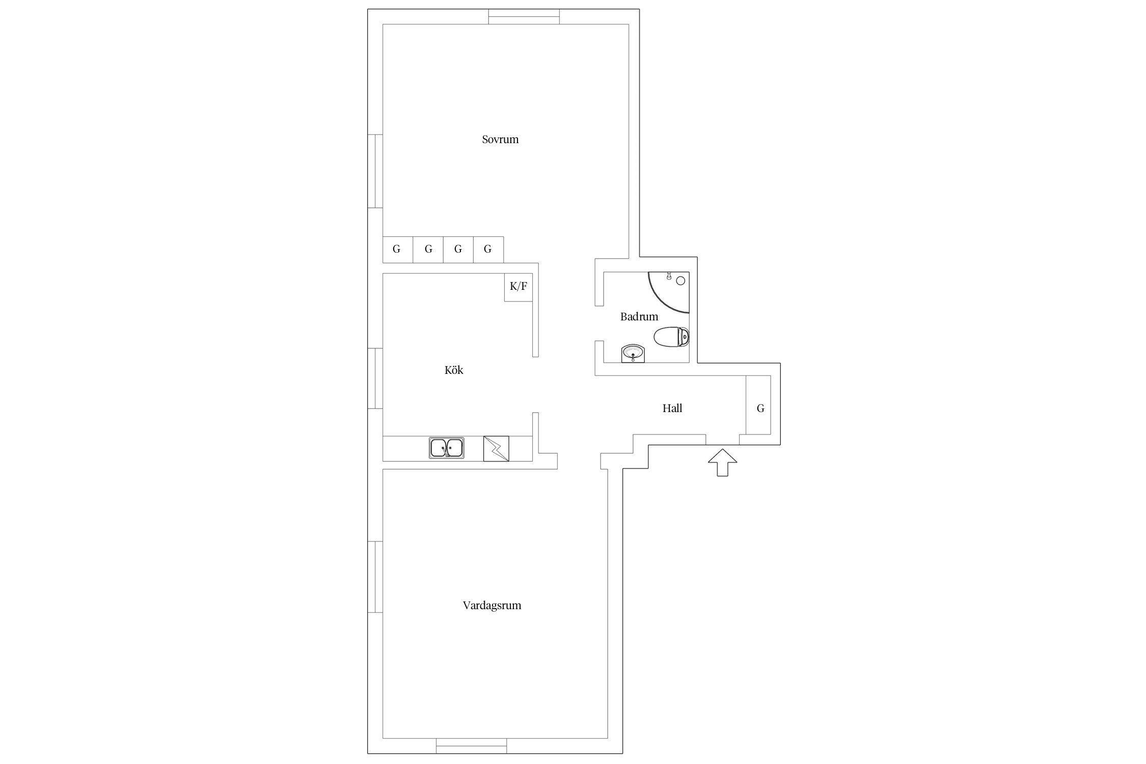 Hallen välkomnar dig in i denna charmiga bostad. Här finns plats till hallmöblemang och avhängningsmöjligheter Väggarna är ljusa och brädgolvet i original leder dig vidare in till bostadens samtliga rum. Här slås du direkt av en känsla av ljus och rymd tack vare en generös takhöjd och fönster i tre väderstreck.