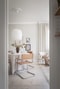 Vardagsrummet ligger i gavel och har fönster från två väderstreck. Tack vare rummets placering, ljus väggkulör och den generösa takhöjden präglas rummet av en luftig känsla. Rummet är lättmöblerat och rymmer plats för både soff- och matgrupp.