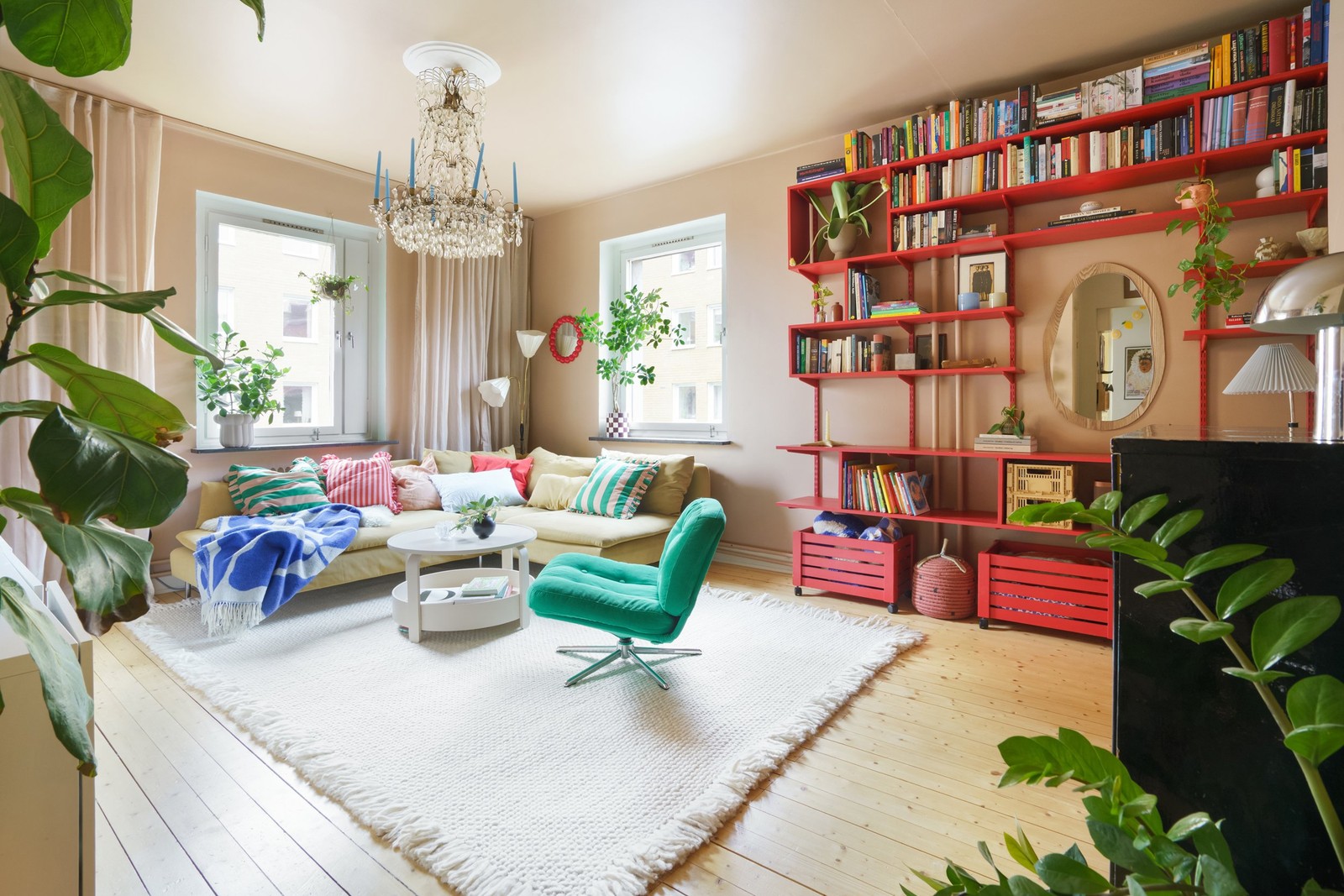 Till höger om hallen ligger det hemtrevliga vardagsrummet där ljuset flödar in. Rummet är lättmöblerat och rymmer både soffgrupp och matsalsdel om så önskas. Det generösa ljusinsläppet i kombination med den fina takhöjden skapar en luftig och inbjudande atmosfär.