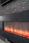 Vidare in i vardagsrummet är väggarna målade i vitt och på golvet ligger samma fina golv. Här möts man av stora fönsterpartier som bidrar med ett härligt ljusinsläpp. Tack vare de generösa ytorna ges utrymme för ett stort middagsbord. Det trivsamma rummet är lätt att möblera med såväl soffgrupp och skrivbord. Man har även byggt upp en stenvägg med perfekt plats för tv:n. Under denna sitter en inbyggd elektriskt eldstad från Contura och stålramen har en enkel och modern design. Bakgrundsbelysning med modern LED-teknik kan ställas in i 12 kulörer efter vilken stämning man vill skapa för tillfället. LED-belysningen styrs liksom flammorna med fjärrkontrollen och kan ställas in att växla mellan olika kulörer i en jämn cykel, låsas vid en nyans eller stängas av helt för att bara njuta av lågorna i ramen.