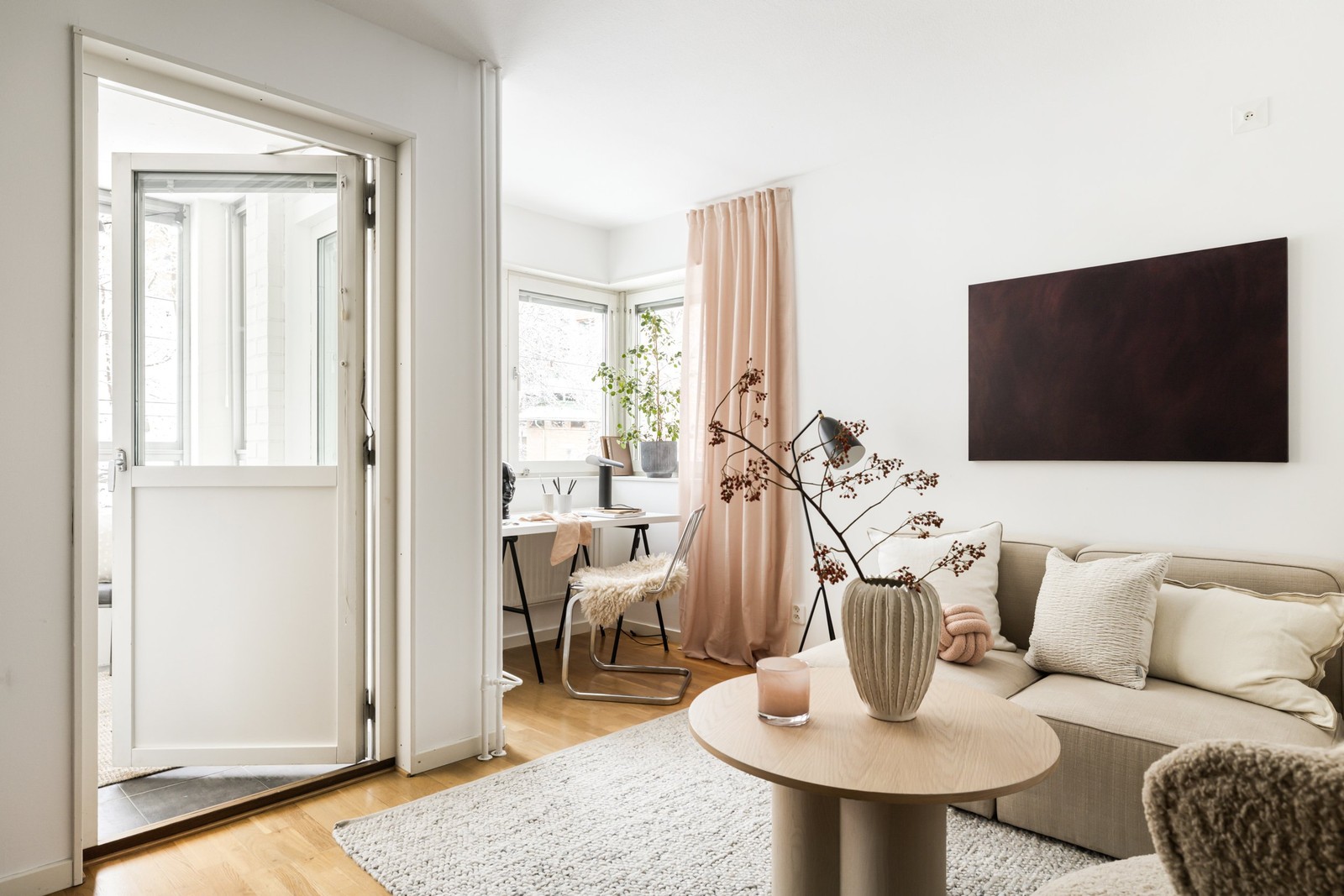 Ta er vidare till vardagsrummet som erbjuder plats åt er soffgrupp. Det stora fönsterpartiet släpper in ett vackert ljus som ger rummet en luftig atmosfär. Intill fönstret finns dessutom en naturlig yta som lämpar sig väl som arbetsplats eller matbord. Från vardagsrummet nås den trevliga balkongen med grönskan som närmsta granne och inglasningen förlänger säsongen.
