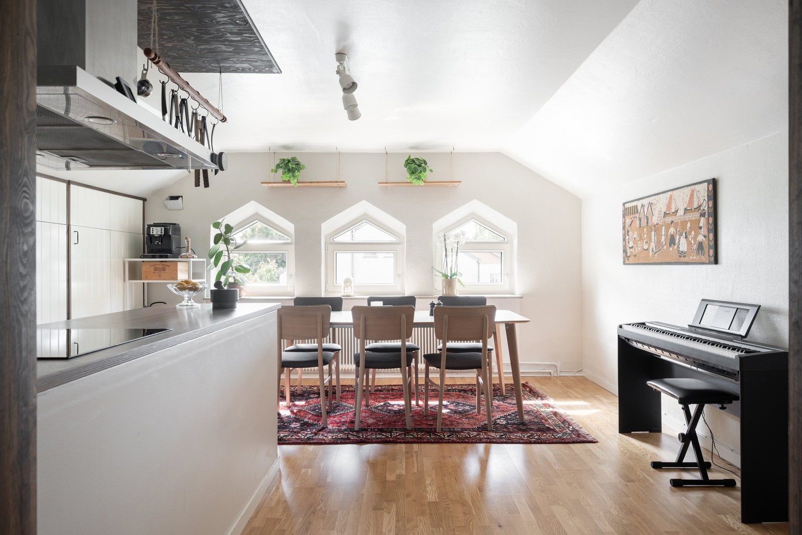 Varmt välkomna till denna mycket karaktäristiska och charmiga vindstvåa där snedtak, takbjälkar och vackert utformade fönster bidrar till en unik atmosfär och skapar en hög mysfaktor. Här bor ni i en bostad som kombinerar genuin karaktär med moderna bekvämligheter. Köket är rymligt, smakfullt renoverat och utrustat med all maskinell utrustning som kan önskas för en smidig vardag. Tack vare den öppna och sociala planlösningen blir köket bostadens naturliga hjärta, en självklar samlingsplats för såväl vardagsmiddagar som större bjudningar där vänner och familj kan umgås i en trivsam miljö. Planlösningen är smart utformad och genomgående med fönster i två väderstreck, vilket skapar ett behagligt ljusflöde under hela dagen. Från bostaden bjuds dessutom en vacker utsikt över föreningens grönskande trädgård som ramas in av lummiga träd och buskar. Här finns både gemensamma uteplatser, pallkragar för odling samt grillmöjligheter som ger fina förutsättningar för sociala stunder utomhus. Utöver detta erbjuds generösa förvaringsmöjligheter i praktiska kattvindar, en separat garderob samt ett fräscht badrum med allt man behöver. Till varje lägenhet i föreningen hör dessutom en egen parkeringsplats, vilket gör vardagen extra bekväm.