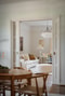 Till höger i entréhallen, innanför en dörröppning med detaljskurna dörrfoder med sockelklossar, öppnar sig en förhall med ekparkett i holländsk läggning med fris. De tidstypiska listverken kommer igen och hallen förbinder till matsal och sällskapsytor i fil. Det var härinne som det sena 20-talets gäster välkomnades innan de bjöds in i salongerna. Idag har det trivsamma rummet platsbyggda bokhyllor.