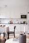 Vidare in i hemmet finner ni bostadens hjärta och givna sällskapsyta. Här samsas kök och vardagsrum på en väldisponerad yta i en öppen och social planlösning. Väggarna är vitmålade och på golvet ligger ett ljust och trendigt parkettgolv vilket gör det enkelt att inreda efter.