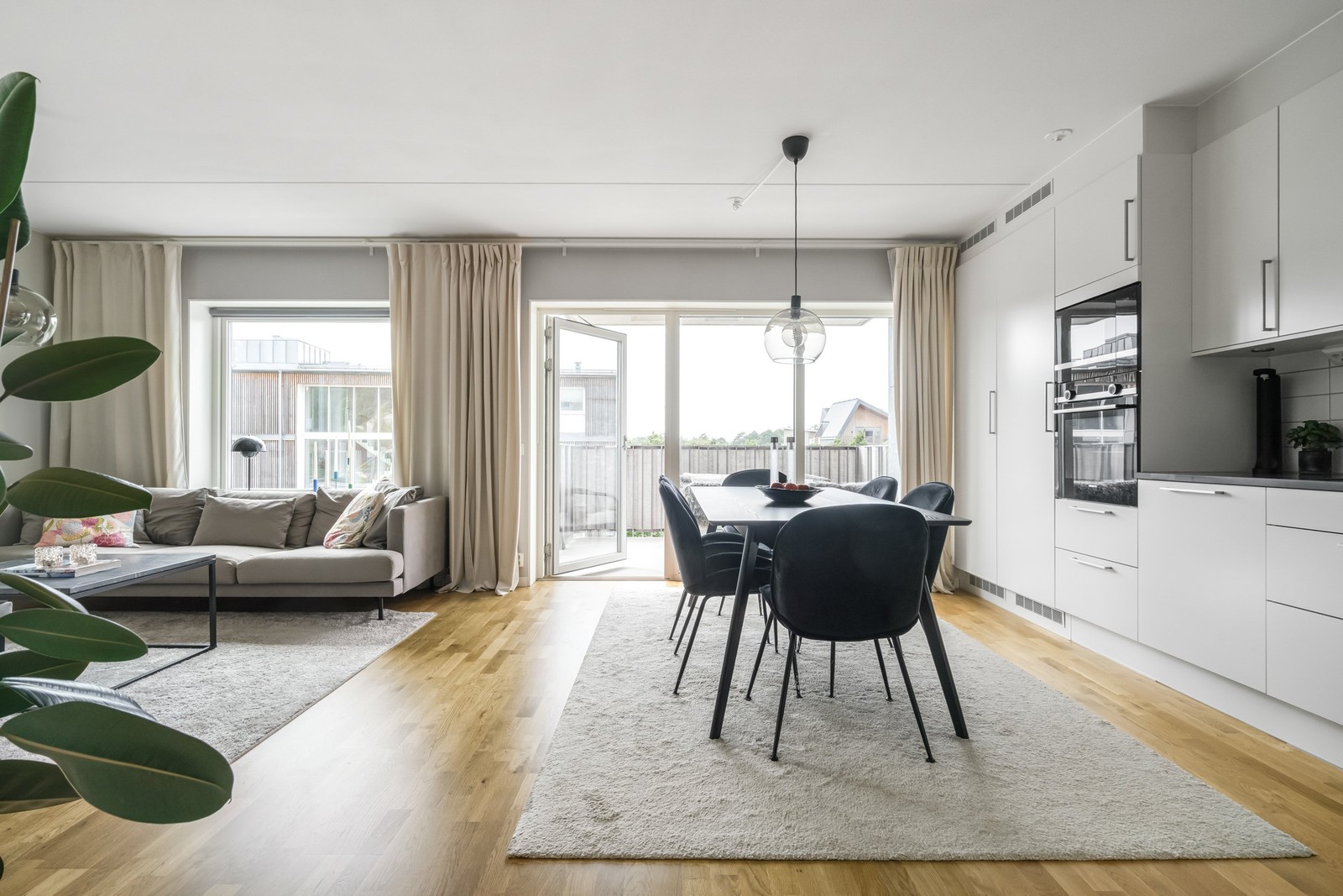 Välkommen till denna stilrena trerummare om 76 kvm, där havsutsikten syns från det stora sovrummet vilket blir en av de självklara höjdpunkterna. Här vaknar du till glittrande vatten och får en mjuk start på dagen med naturens skiftningar som bakgrund.