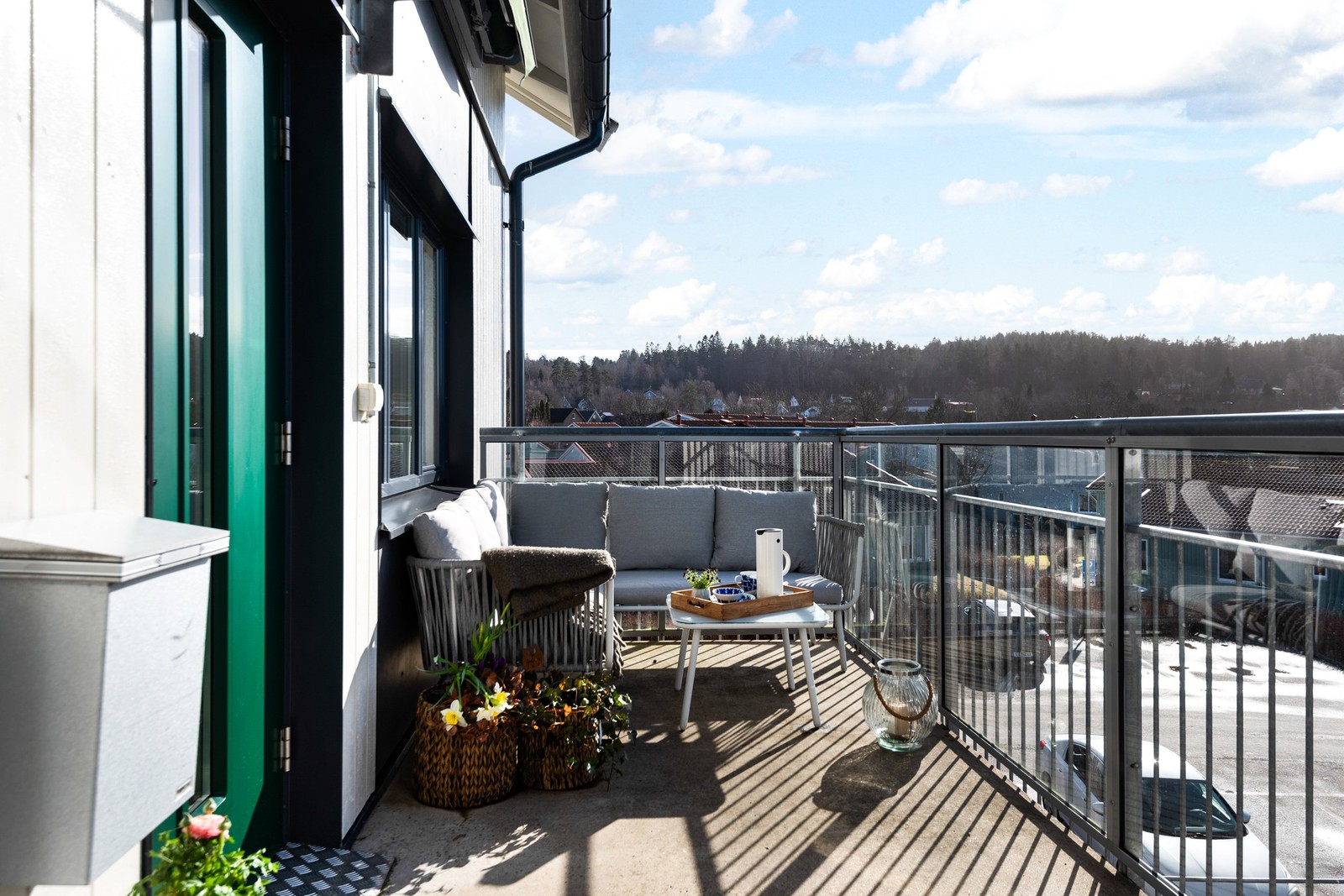 Ta hissen eller trapporna till våning 3. Utanför entrén möts ni av den soliga balkongen med plats för loungemöblerna. Här finns markis om ni föredra skugga.