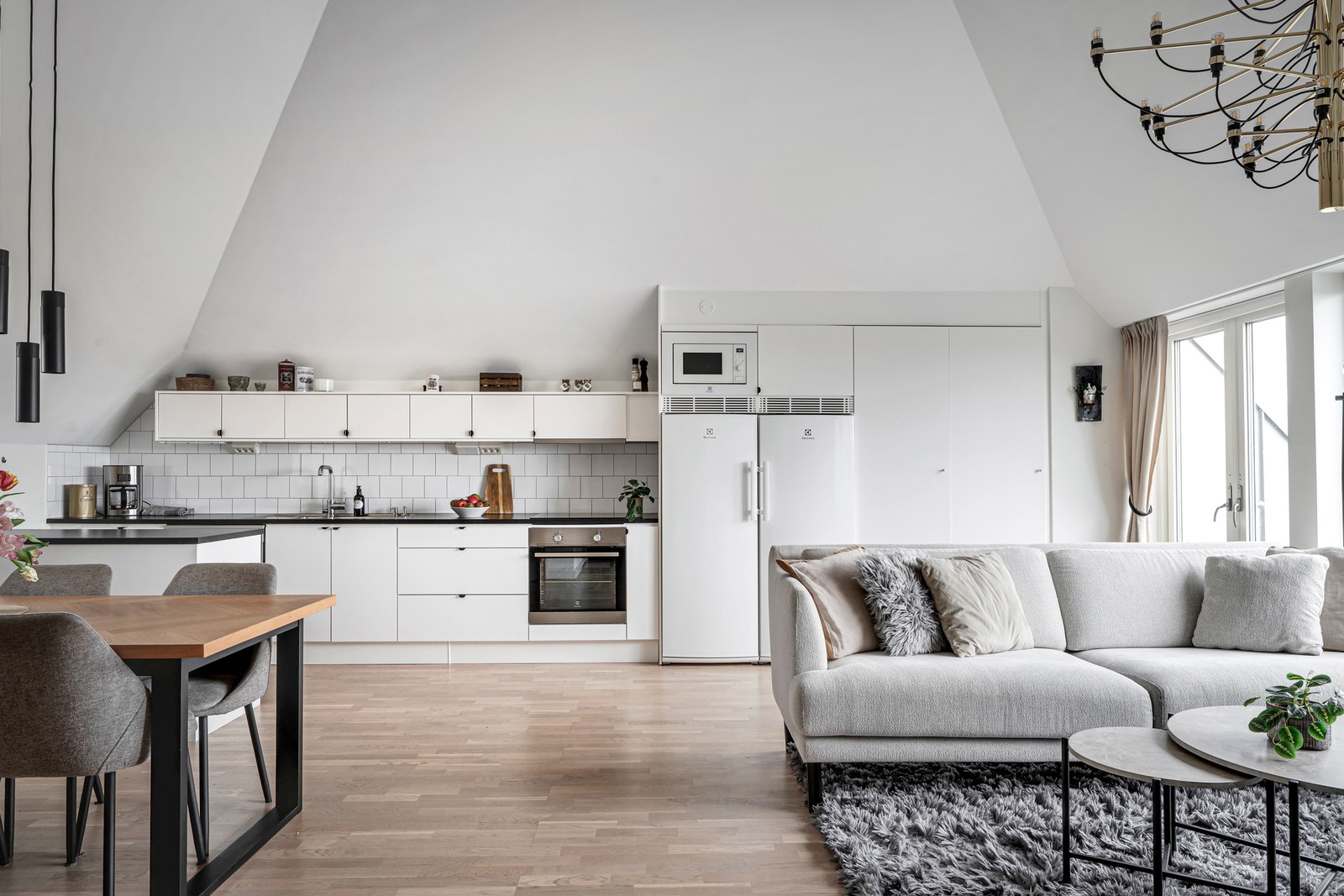 Spatiös vindsvåning med föreningens absolut bästa läge. 5,5m till taknock