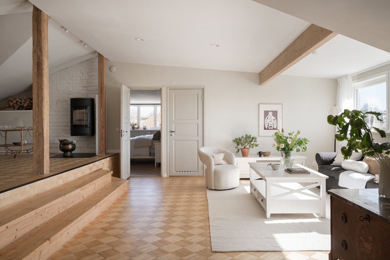 Vardagsrummet är stort och rymligt med plats för både en generös soffgrupp och en större matgrupp. Några trappsteg upp finns en upphöjd del som skapar karaktär och ger möjlighet att dela av ytorna på ett elegant sätt – sällskapsdel eller kanske en läshörna. Här finns även en kamin och fantastiska träbjälkar som förgyller känslan av hem. Fönster i flera väderstreck bjuder på en fantastisk vy över lummiga trädgårdar, takåsar och Liseberg – en utsikt som ger bostaden det lilla extra.