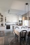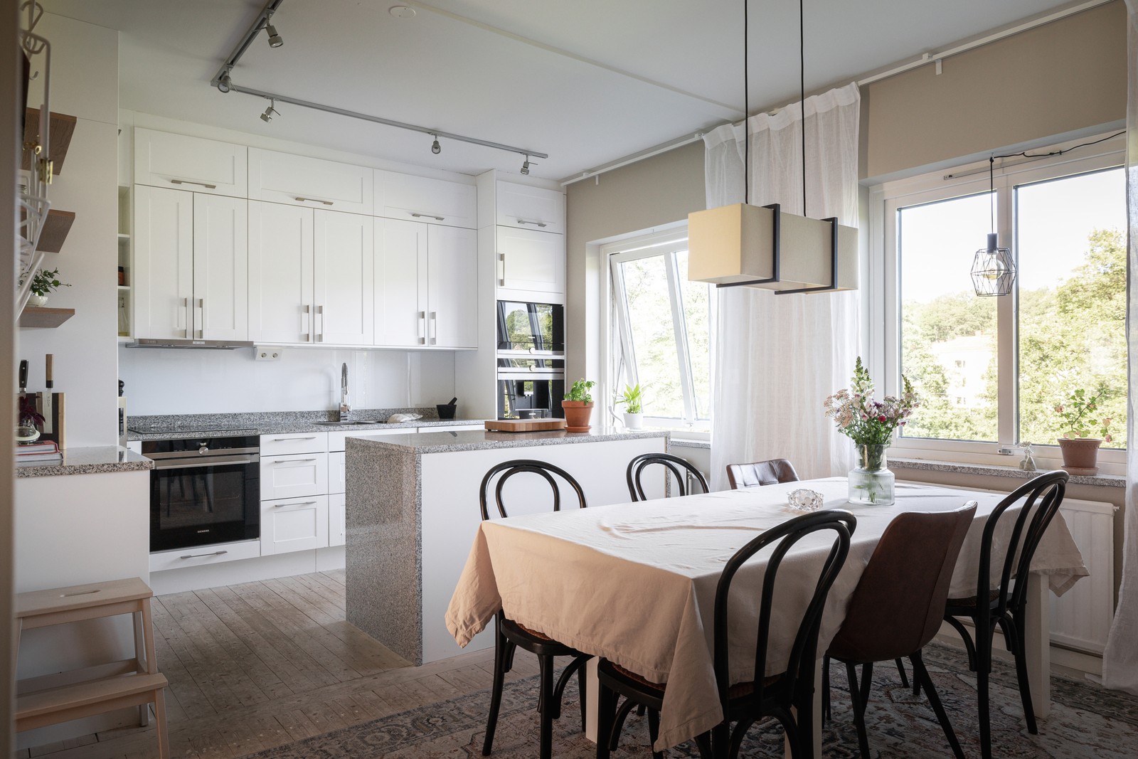 Vidare från hallen möts ni av det socialt planerade köket. Köket är smakfullt renoverat med vita köksluckor med massor av förvaring och luckorna matchas fint ihop med en stenskiva. Samma stenskiva finner ni på köksön som även följer ner mot golvet, en snygg touch som ger en exklusiv och unik utformning. Stenskivan matchas utmärkt med fönsterbänk i sten. Köksön ger gott om arbetsyta för matlagning och är den naturliga avskiljaren mellan köksdelen och placering av middagsbordet. En alldeles perfekt plats för större matbord. Här flödar ljuset in otroligt fint från två stora fönsterparti och utanför finns enbart härlig grönska att blicka ut mot. I köket finns även ett skafferi / garderob. Den maskinella utrustningen består av induktionshäll, kyl/frys, ugn, micro, fläkt samt diskmaskin.